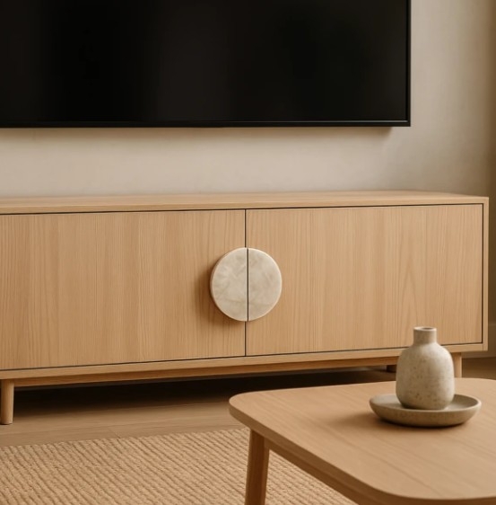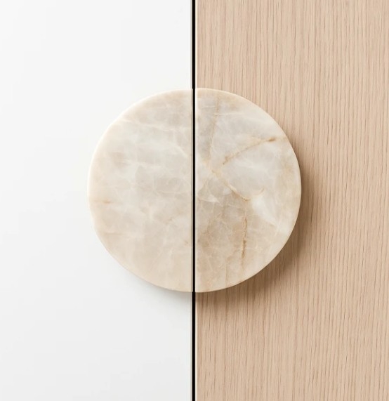 Materiale: Naturlig Taj Mahal-kvartsitt Finish: Polert Form: Rund – 2 halvdeler inkludert Tilgjengelige diametre: 150 mm, 180 mm, 200 mm, 220 mm, 250 mm (andre størrelser tilgjengelig på forespørsel) Tykkelse: Ca. 20 mm Montering: 2 monteringshull (M5-skruer inkludert) Underskjæring: På undersiden av håndtaket – for enklere grep. Pris: Per sett med 2 halvdeler.