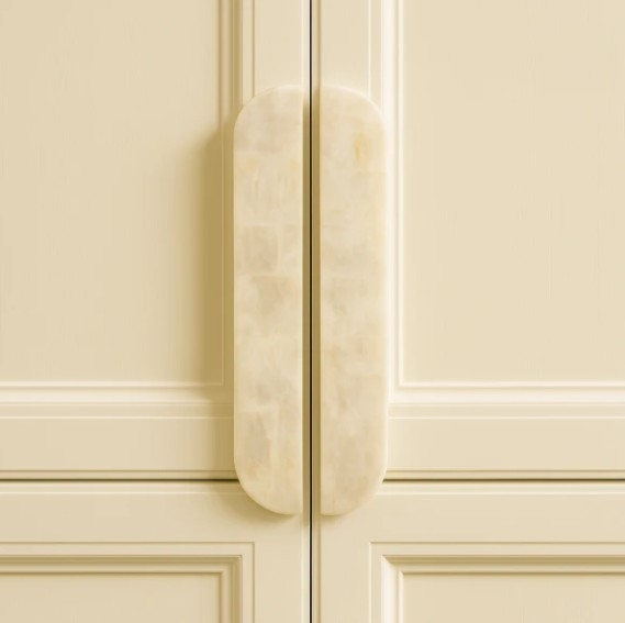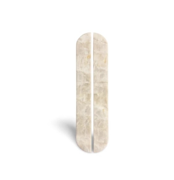 Lengde: 320 mm Montert bredde: 80 mm Steintykkelse: 20 mm Materiale: Naturlig Taj Mahal-kvartsitt (opprinnelse: Brasil) Finish: Polert, høyglans Montering: Messinghylser med M5-gjenger Skrueavstand: 160 mm (europeisk standard) Monteringsskruer: inkludert Pris: for et sett med to halvdeler. Håndlaget av Marmurowa Pracownia.