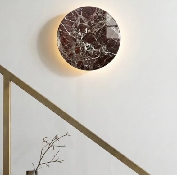 Inspirert av måneskinnet, denne designervegglampen avgir et varmt LED-lys som fremhever steinens intense farge og gir en luksuriøs atmosfære til ethvert rom. Rosso Levanto Moon marmorvegglampe er en unik vegglampe som kombinerer eleganse med den unike karakteren til naturstein. Denne designervegglampen i marmor, inspirert av måneskinn, sender ut varmt LED-lys som fremhever steinens intense farge og gir interiøret en luksuriøs atmosfære. Rosso Levanto – en marmor full av uttrykk Rosso Levanto-marmoren kjennetegnes av sin dype, burgunderfarge, ispedd lyse, kontrasterende årer. Hver marmorvegglampe i denne utgaven er unik – steinens årer skaper et naturlig bilde, noe som gjør hvert stykke til en unik veggdekorasjon. Lampens skive er 1 cm tykk og er polert for å ytterligere forbedre fargen og åretegning av Rosso Levanto-marmoren. Dette gjør at marmorvegglampen ikke bare lyser opp rommet, men også blir en særegen aksent.