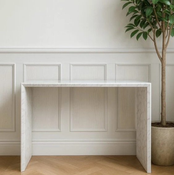 Carrara Essence-marmorkonsollen kombinerer minimalistisk form med den tidløse skjønnheten til naturstein. De slanke linjene og subtile proporsjonene fremhever den særegne åretegning av Carrara-marmoren, noe som gjør den til et elegant aksent til ethvert interiør. Denne marmorkonsollen er ikke bare et praktisk møbel, men også en særegen designdetalj. Carraramarmor – en verdenskjent stein Carraramarmor er en av de mest berømte natursteinene, utvunnet i Toscana, Nord-Italia. Siden antikken har den blitt brukt til skulptur og arkitektur – det var fra Carrara-marmor at Michelangelo hugget sine største verk. Steinens lyse bakgrunn med subtile grå åretegning gir den en unik eleganse og gjør denne marmorkonsollen til et førsteklasses møbel. Carraramarmor er perfekt for både klassisk og moderne interiør. Den finnes på luksushoteller, villaer og leiligheter over hele verden. En marmorkonsoll laget av dette råmaterialet er valget til folk som verdsetter tidløs stil og naturlig skjønnhet.