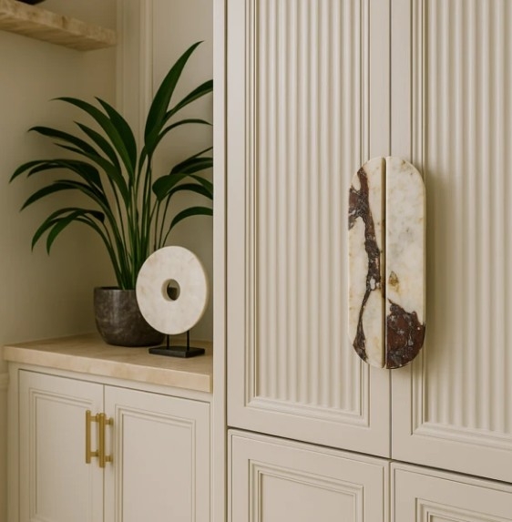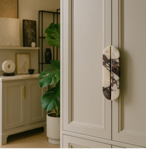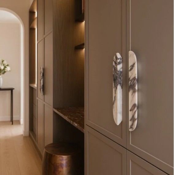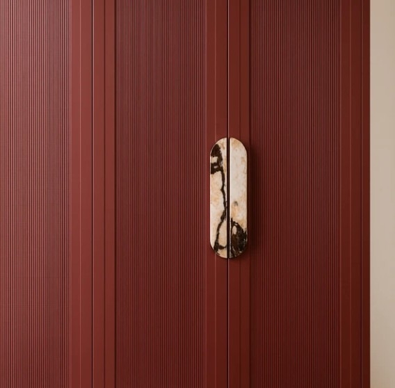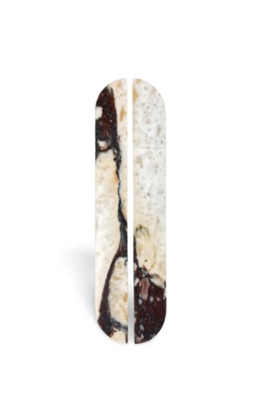 Møbelhåndtaket Calacatta Viola Slim L er et unikt interiørdesignstykke som kombinerer elegansen til italiensk marmor med presisjonen i håndlaget håndverk. Den intenst naturstein i burgunder, lilla og brunt, satt mot en melkehvit base, gir hvert håndtak en unik karakter. Denne løsningen skiller møblene og gir interiøret et tidløst, luksuriøst preg.