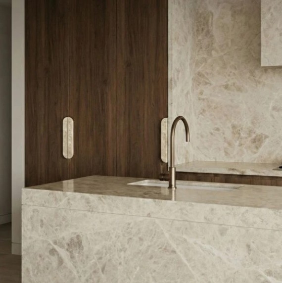 Taj Mahal Slim L-håndtaket i stein er laget av kvartsitt utvunnet i Brasil. Dette mineralet er verdsatt ikke bare for sitt unike utseende, men også for sin eksepsjonelle motstand mot fuktighet, slitasje og riper. Den polerte kvartsittoverflaten reflekterer lyset vakkert, og fremhever fargedybden og materialets eksklusivitet. Naturlige variasjoner i teksturen gjør hvert håndtak i stein unikt.