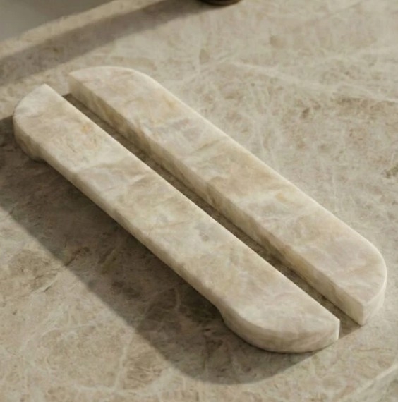 Eleganse i sin reneste form – Taj Mahal Slim L steinmøbelhåndtaket kombinerer den naturlige skjønnheten til brasiliansk kvartsitt med et moderne, minimalistisk design. Håndlaget, har det en subtil krembeige fargetone og gullårer, noe som gir det en tidløs karakter. Denne eksklusive detaljen forvandler en vanlig møbelfront til et unikt møbel.