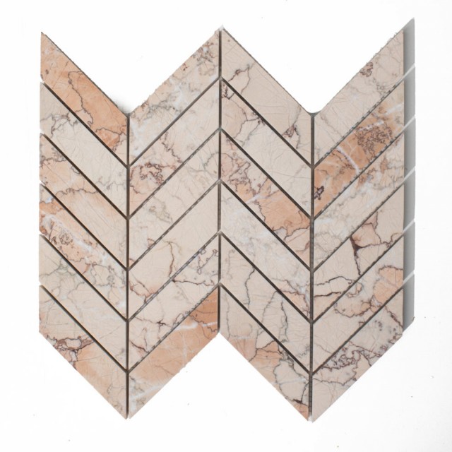 Sakura Chevron Marmormosaikk Et klassisk chevronmønster, et fiskebensmønster (flettemønster), en tidløs modell av håndlaget marmormosaikk. Laget av 7 x 3,8 cm biter, limt til et nettingmønster, er disse platene klare for montering på gulv, vegger, i kjøkken, bad, dusjer, badekaromgivelser, som speilramme i ganger og mer. Hver av våre mosaikker er håndlaget med omhyggelig oppmerksomhet på detaljer. Produsert av Metamar.